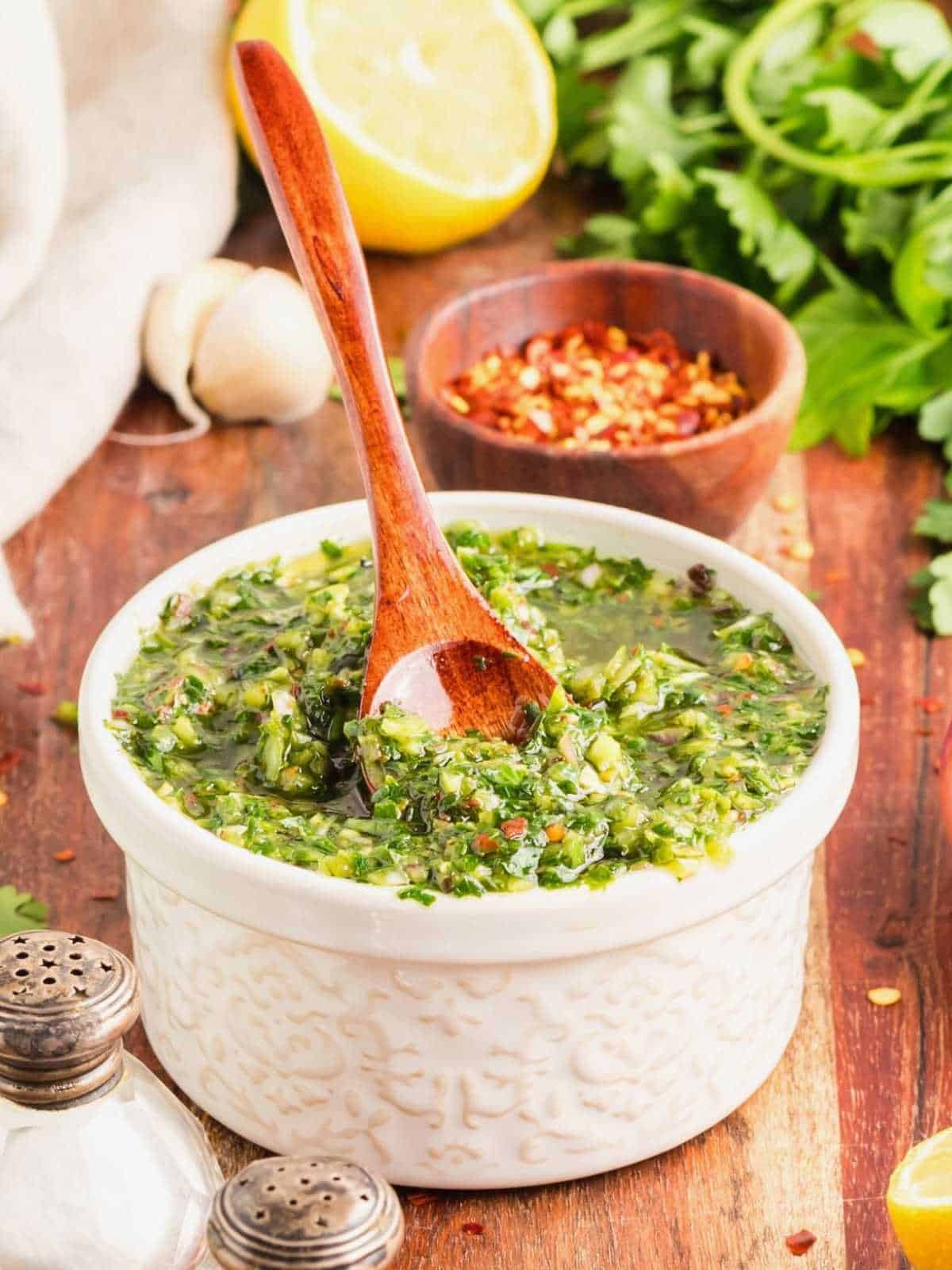 Whether you’re drizzling chimichurri sauce with cilantro over grilled meats, tossing it with veggies, or using it as a dip for crusty bread, this zesty sauce packs a flavorful punch that livens up any meal. It’s one of my favorite sauces to serve over grilled pork tenderloin and roasted chicken!