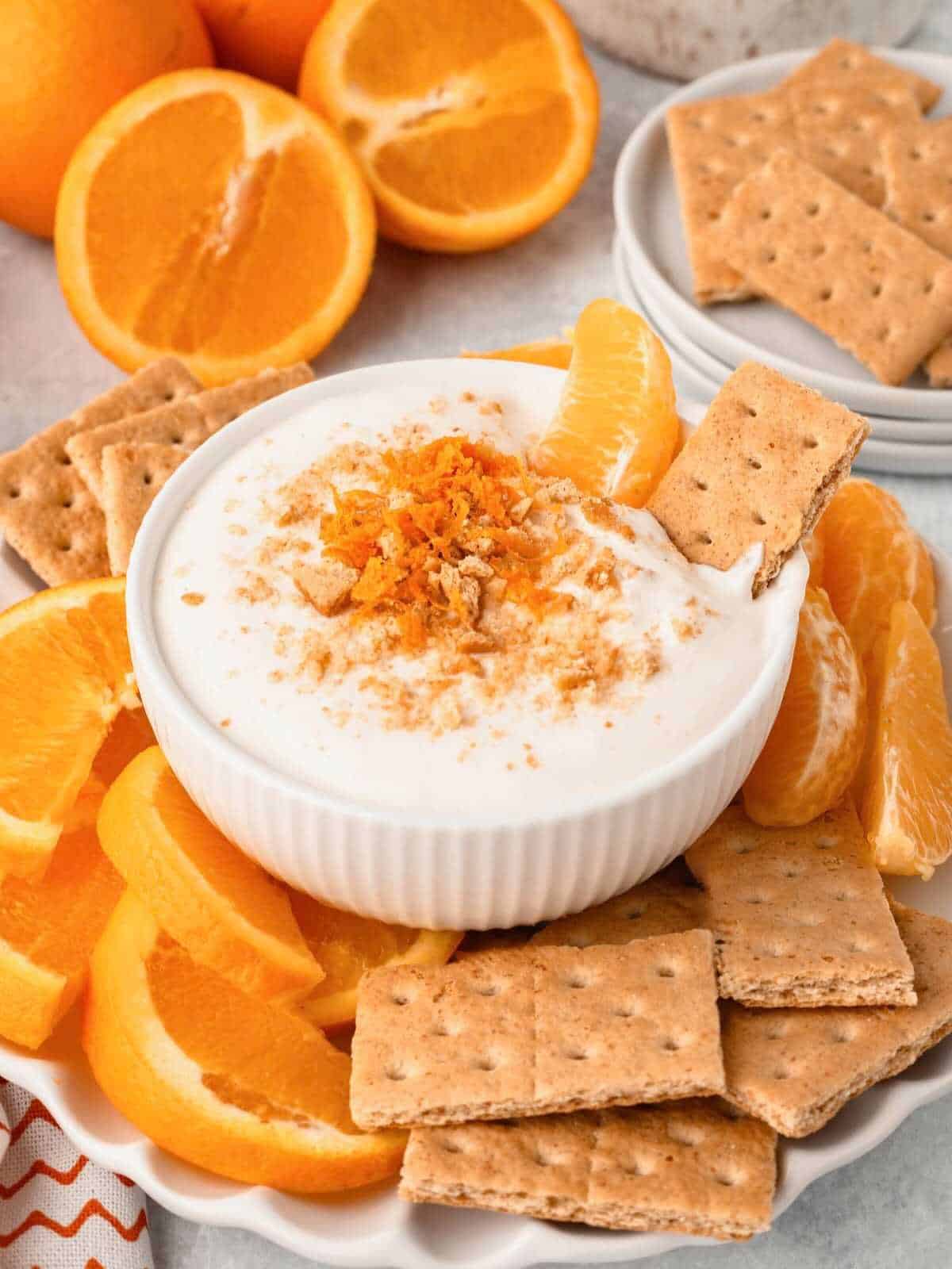 - Serve with graham crackers and orange slices if desired.8 graham crackers,2 oranges, sliced