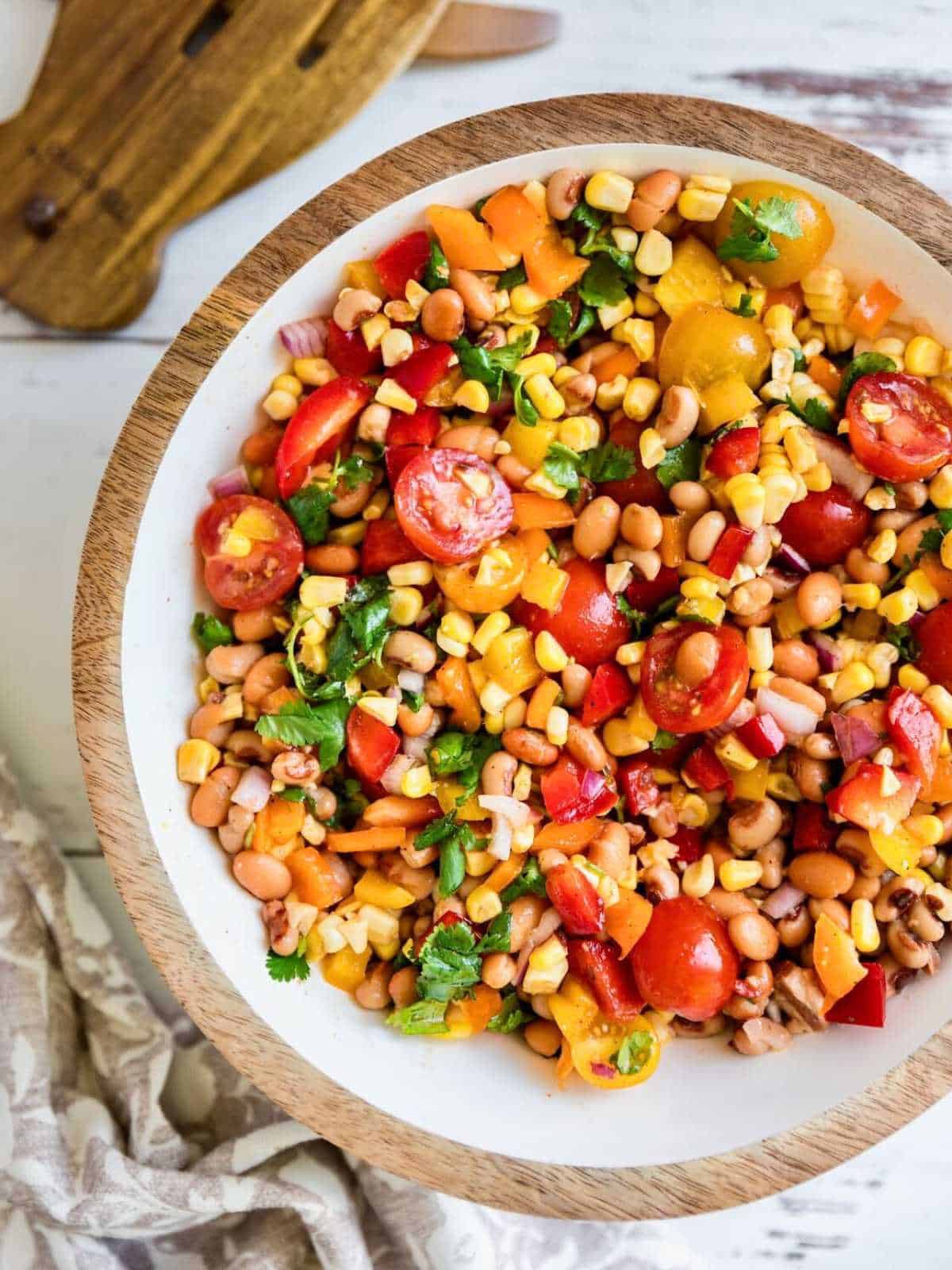 - Assemble: In a large bowl, combine corn, tomatoes, beans, onion, peppers, and cilantro. Toss with the dressing and stir well. Chill in the refrigerator for at least 30 minutes before serving for the best flavor.
