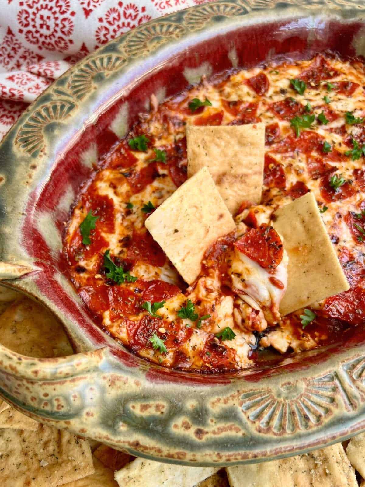 Our family can’t get enough of this pizza flavored dip that doesn’t skimp on flavor. I’ll be the first to say I like it better than a slice!