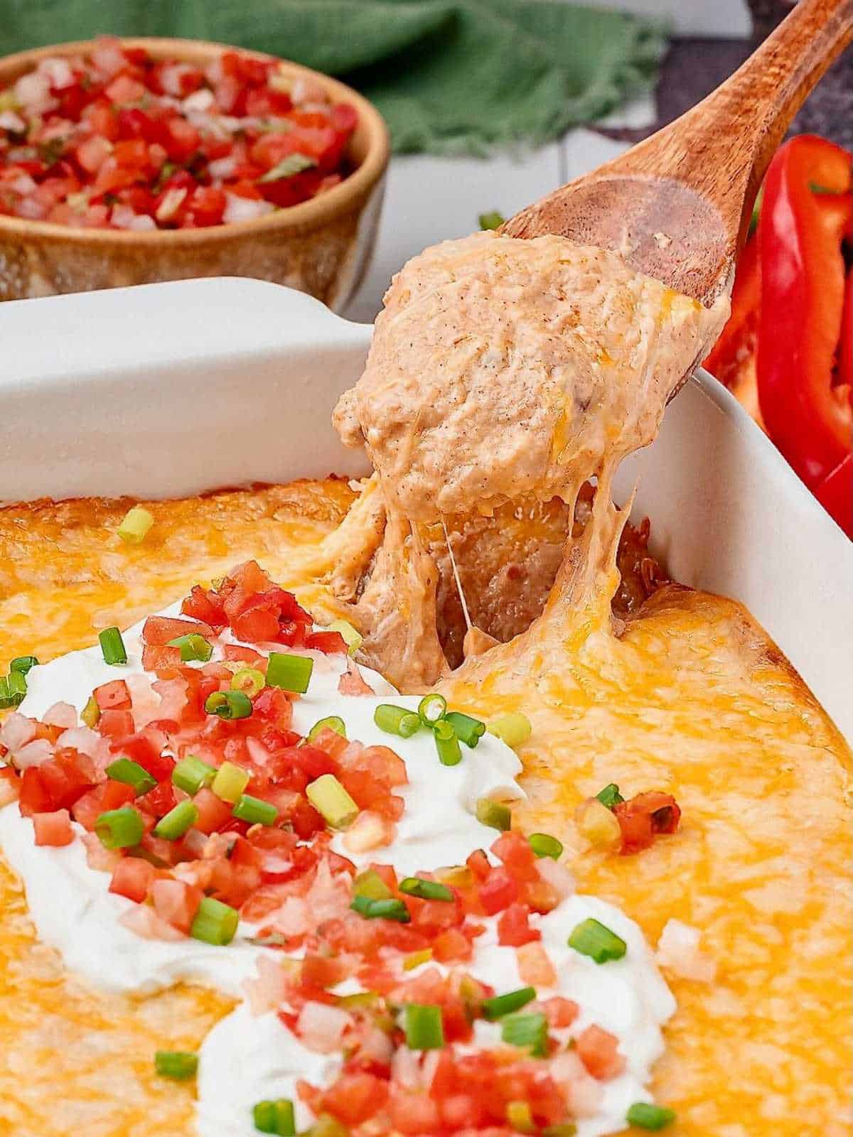 - Bake for 25 to 30 minutes until bubbly and fully melted. Let dish rest for ten minutes, then top with pico de gallo, sour cream, and green onions.