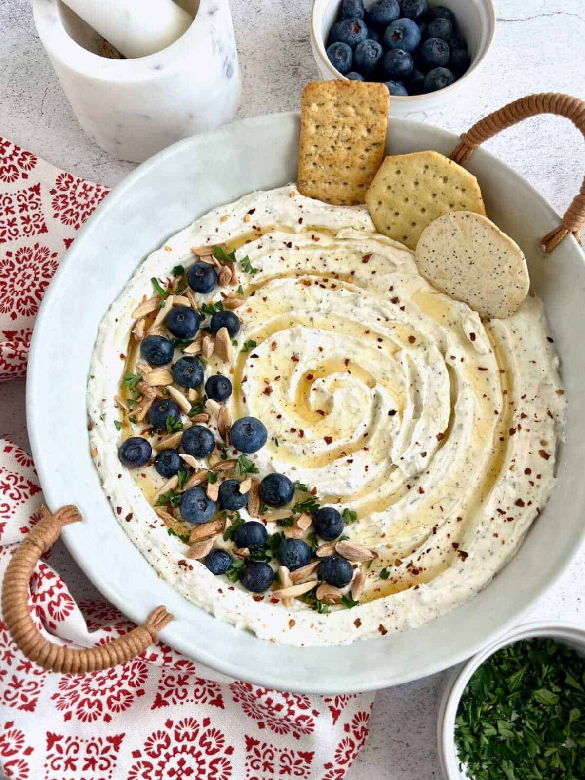 - Drizzle honey in the indentions with a spoon or use a honey container with a nozzle. If desired, sprinkled one side of the dip with blueberries, toasted almonds, crushed red pepper and parsley.¼ teaspoon crushed red pepper flakes,2 Tablespoons slivered almonds,¼ cup fresh blueberries,2 Tablespoons honey,1 Tablespoon fresh parsley
